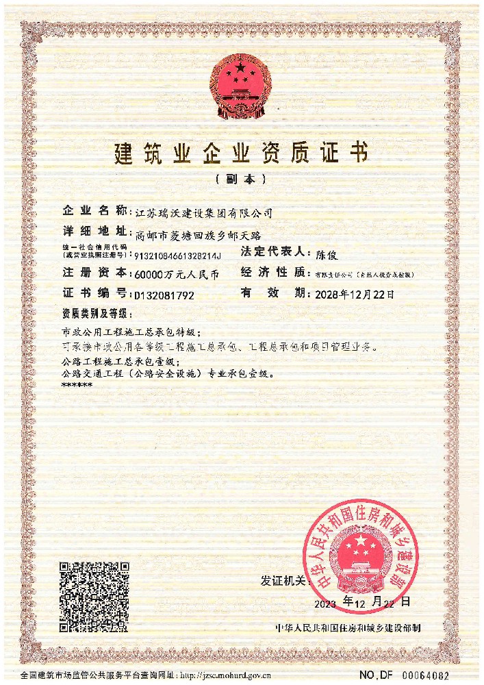 江蘇瑞沃建設(shè)集團(tuán)有限公司成立于2007年,是一家以市政、交通工程建設(shè)為主導(dǎo),集房屋建筑、交通安全設(shè)施、城市道路照明工程、電力工程、隧道工程、航道工程及投融資為一體的綜合性企業(yè)。企業(yè)注冊(cè)資本60000萬(wàn)元,現(xiàn)有各類技術(shù)人員580人,其中中、高級(jí)以上人員498人,注冊(cè)類人員268人,一、二級(jí)建造師166人。公司榮獲“江蘇省建筑業(yè)優(yōu)秀企業(yè)”、“江蘇省五一勞動(dòng)獎(jiǎng)狀”,連續(xù)多年被評(píng)為“揚(yáng)州市先進(jìn)企業(yè)”、“江蘇省建筑業(yè)百?gòu)?qiáng)企業(yè)”,連續(xù)八年蟬聯(lián)百?gòu)?qiáng)企業(yè)基礎(chǔ)設(shè)施類第一名。